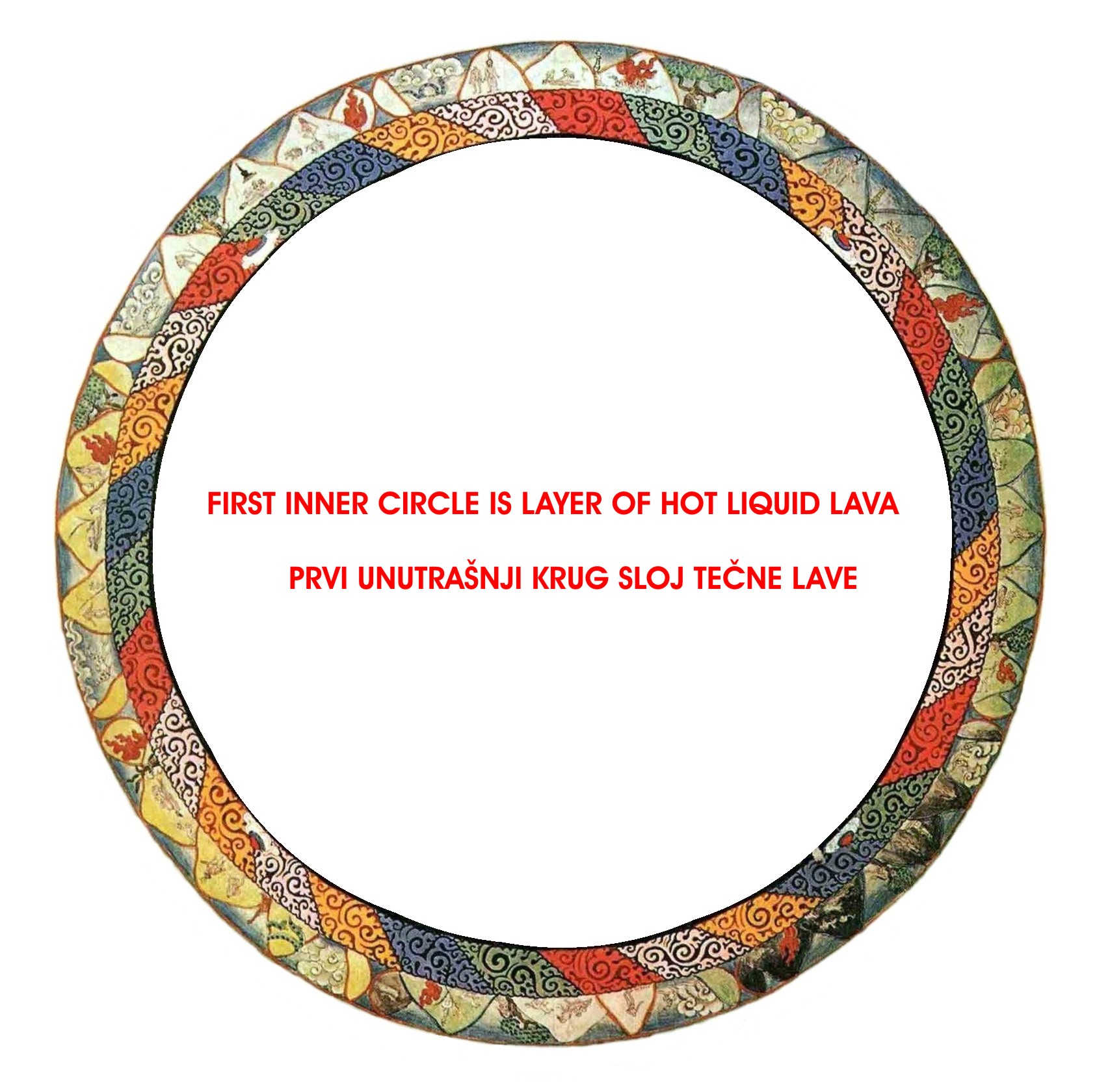 Vajra BlackSphere: This Vajra protective sphere (shell) is kind of spherical electric arc furnace that melts all the matter around this whole sphere, and that is molten lava around Vajra black sphere, shown on above image are layer of molten lava and top layer after molten lava forming crust, after that is outer layers of the planet Earth with atmosphere. Number 1 is Vajra Black Sphere, 2 is core with atmosphere, 3 is molten lava layer
